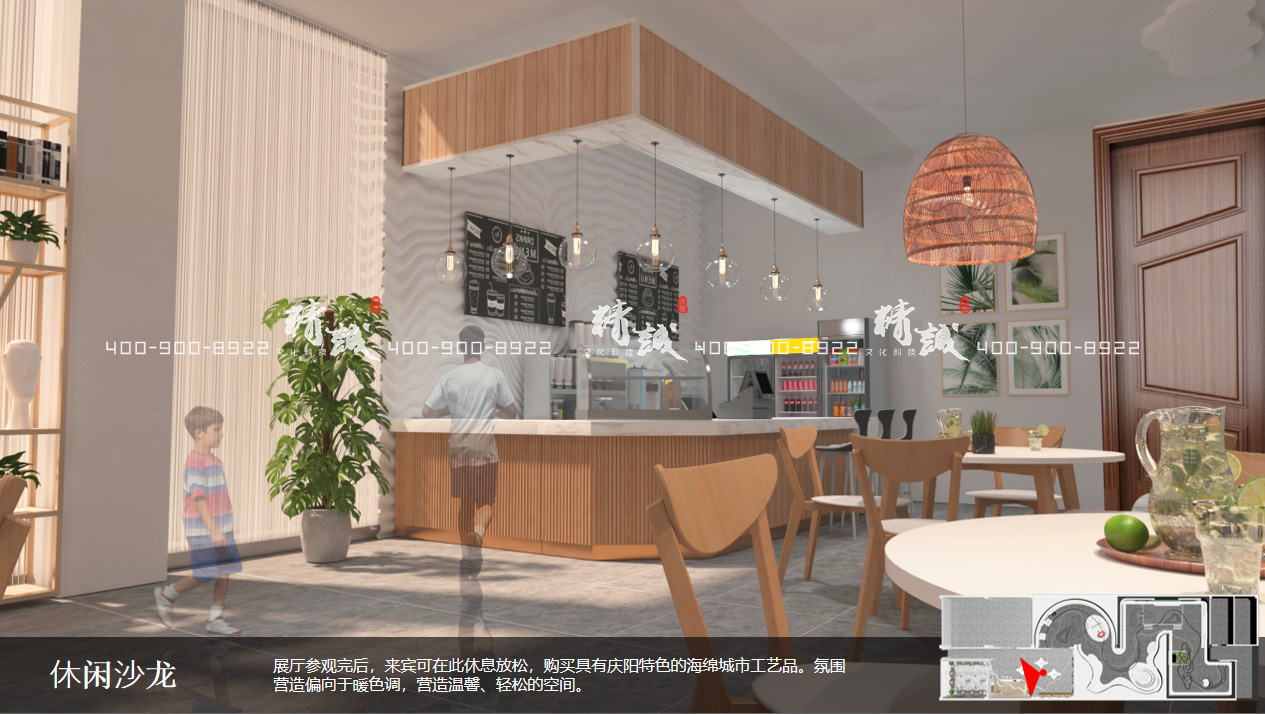 規(guī)劃館參觀完后,來賓可在此休息放松,購買具有慶陽特色的海綿城市工藝品。氛圍營造偏向于暖色調(diào),營造溫馨、輕松的空間。