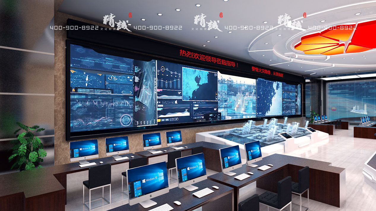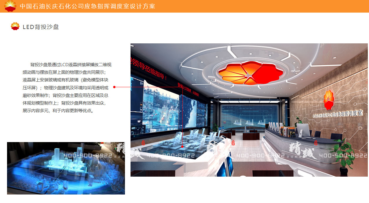 長慶石化石油應急指揮室展廳設計指揮中心風格恢弘大氣,頂部中央用旋轉(zhuǎn)的造型向中心匯聚為長慶石化LOGO,體現(xiàn)指揮調(diào)度向心力,背景墻面用米色石材制作,表面設置電路信息狀燈帶,體現(xiàn)即時反應的信息化功能,整體氛圍著重表現(xiàn)現(xiàn)代化、信息化的指揮調(diào)度中心。