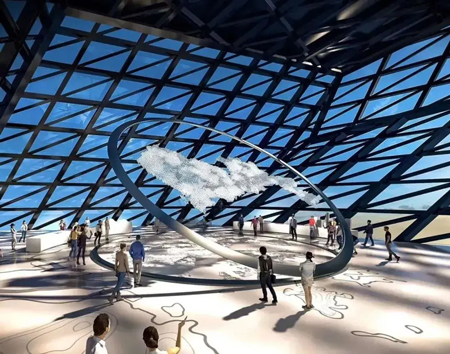 有的展館索性把展館窗戶和窗戶外景觀設(shè)計(jì)進(jìn)來(lái),讓室外自然景觀參與展館大自然氛圍打造,還有的設(shè)計(jì)師把展館多層挑高空間作為中央展示區(qū)考慮,比如位于深圳福田區(qū)的深圳當(dāng)代藝術(shù)與規(guī)劃館,把一個(gè)巨大的環(huán)形雕塑作為展館聚焦點(diǎn),這個(gè)巨大的環(huán)占據(jù)了3層樓的空間,所有的展陳圍繞這個(gè)巨環(huán)展開(kāi),觀眾無(wú)論在一樓還是二樓都會(huì)被巨環(huán)吸引,觀眾在不同角度看到的巨環(huán)展示不同的內(nèi)容和風(fēng)采。
