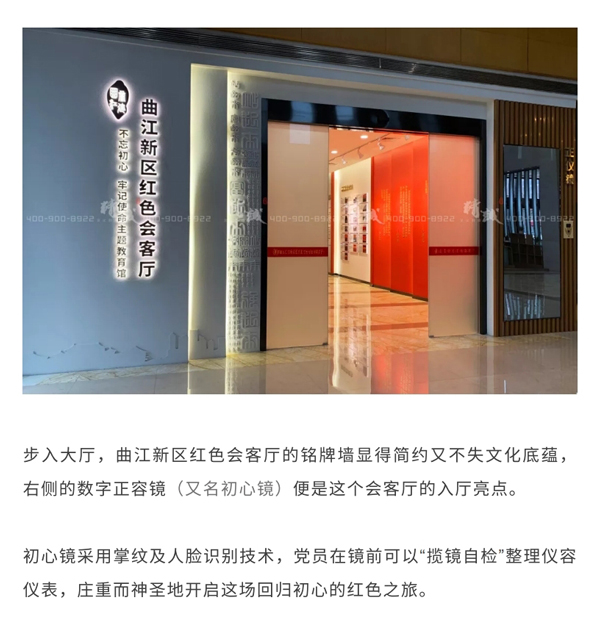 2020年4月,由精誠(chéng)展覽助力打造的西安曲江新區(qū)不忘初心 牢記使命主題教育館(以下簡(jiǎn)稱:紅色會(huì)客廳)落成,該展廳位于曲江文化大廈一層,面積約800平米。