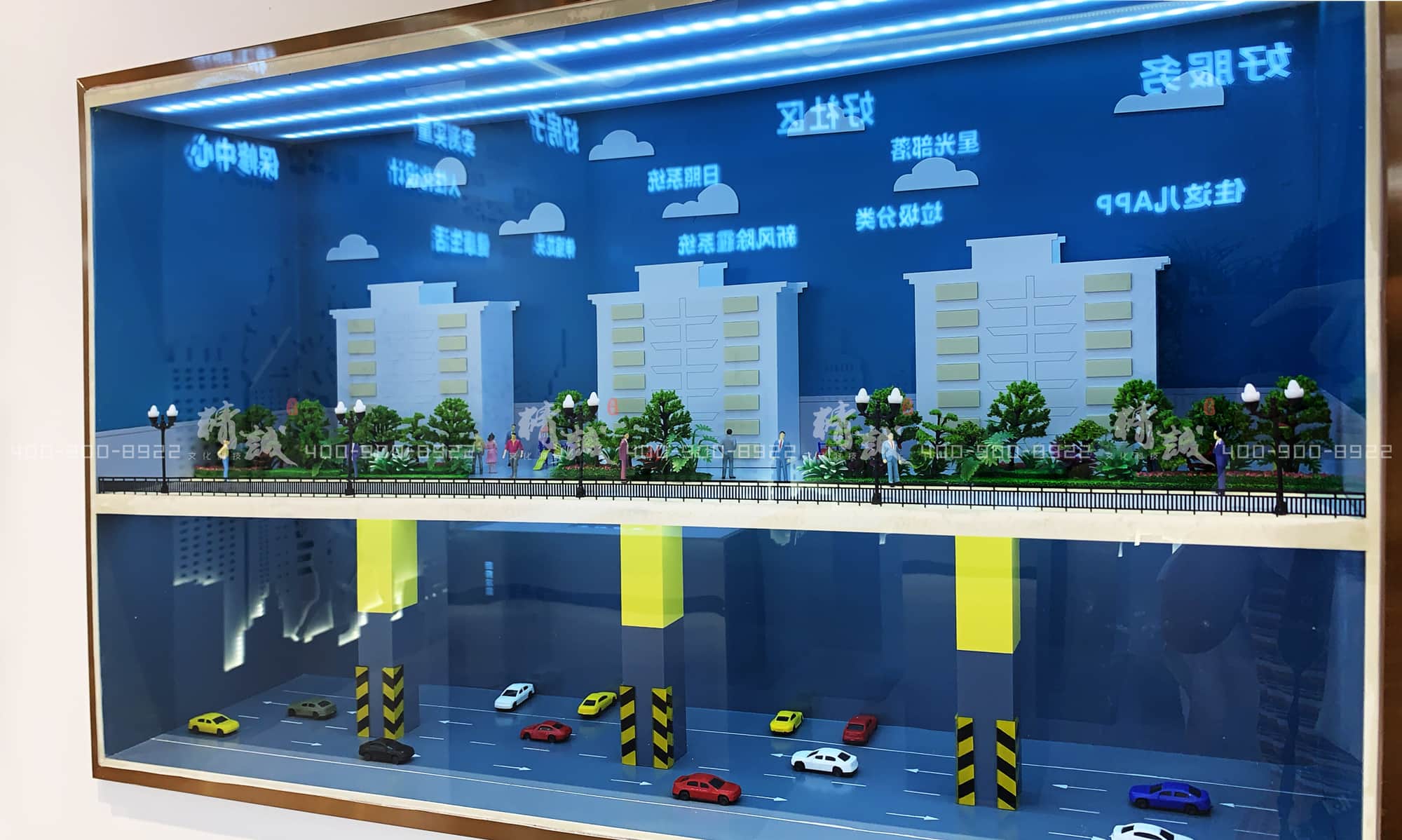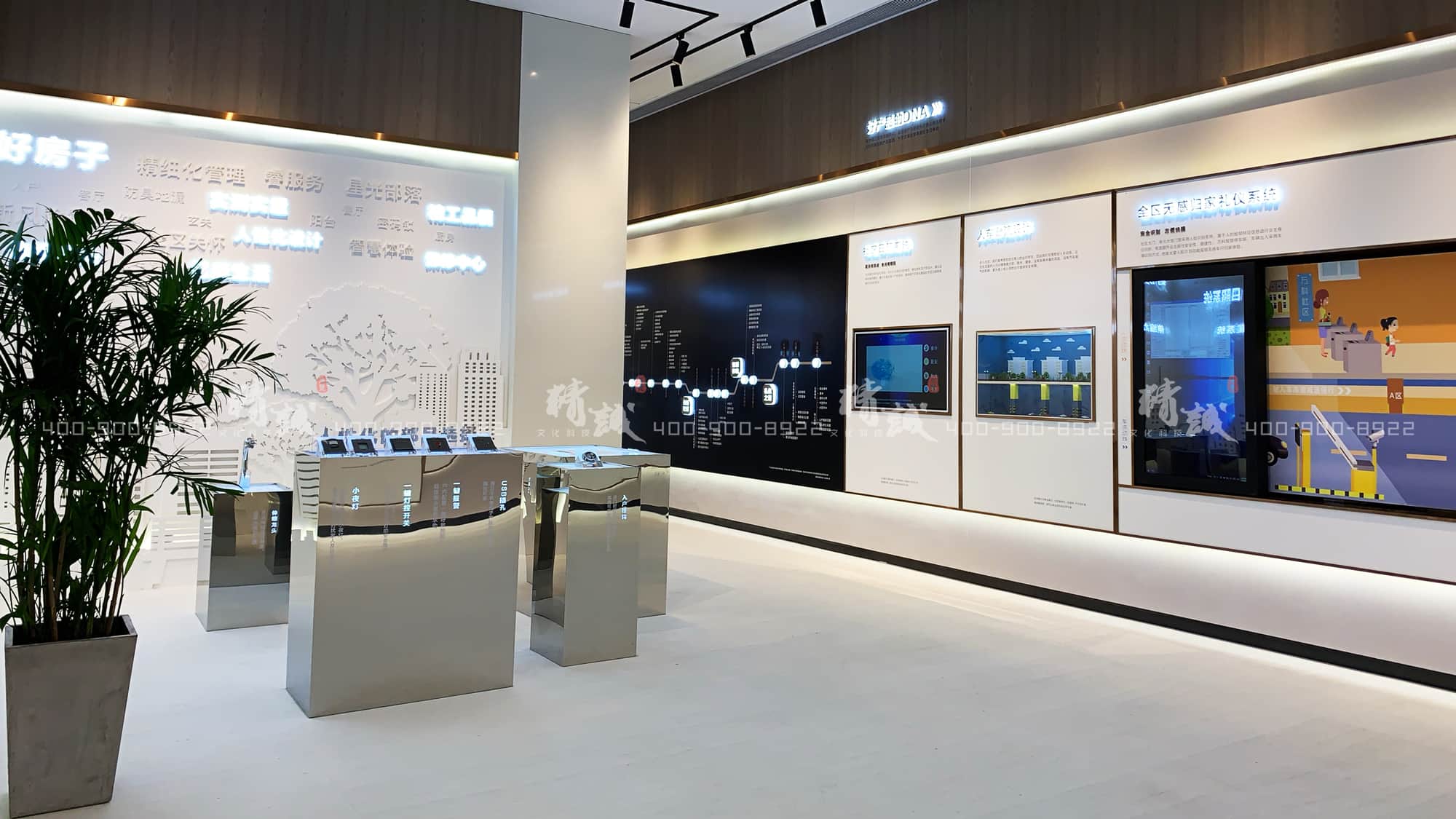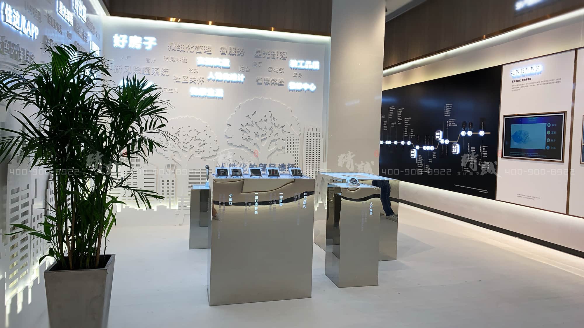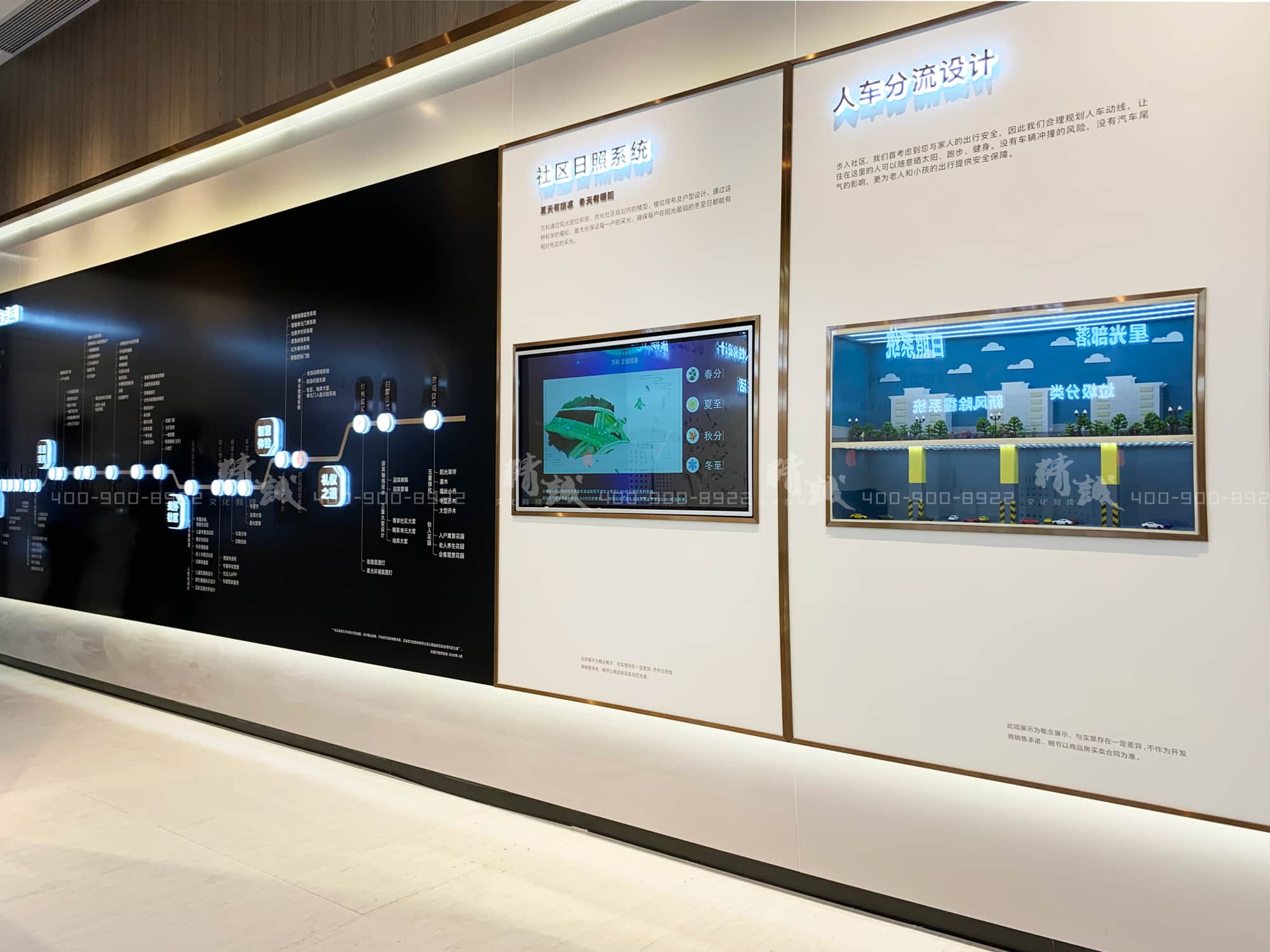 從觸摸屏的社區(qū)日照系統(tǒng)展示,到人車分流的微縮場(chǎng)景,再到互動(dòng)滑軌屏展示的全區(qū)無(wú)感歸家禮儀系統(tǒng)。