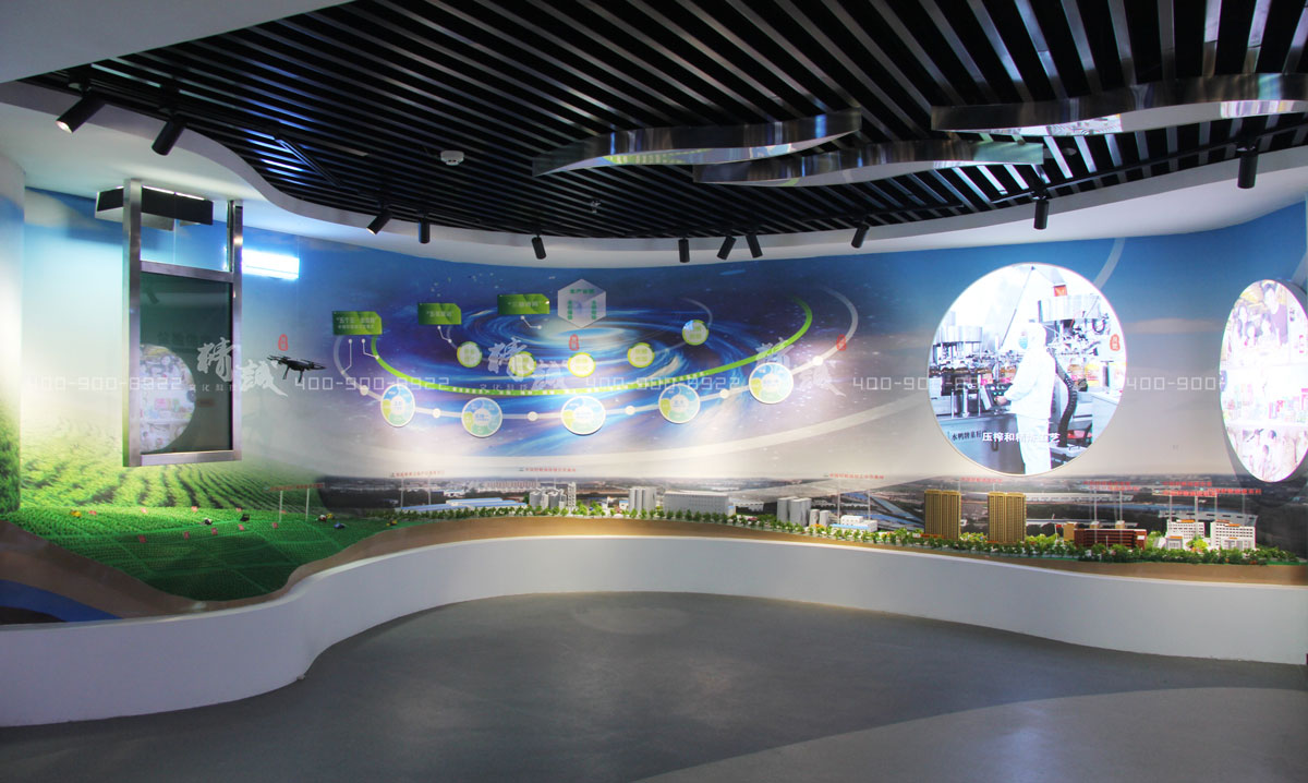 利用數(shù)字投影升級沙盤,配合弧幕投影,以聲光電聯(lián)動的效果播放糧農(nóng)集團宣傳片,給觀者以強烈的視覺震撼。
