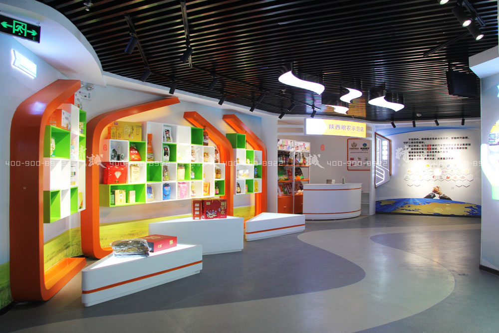 糧倉造型,獨具匠心的產(chǎn)品展架設(shè)計,陳列糧農(nóng)產(chǎn)品,配合展示糧農(nóng)集團服務體系。微縮示范店,線上體驗,線下銷售的體驗,及實體售貨柜陳列。