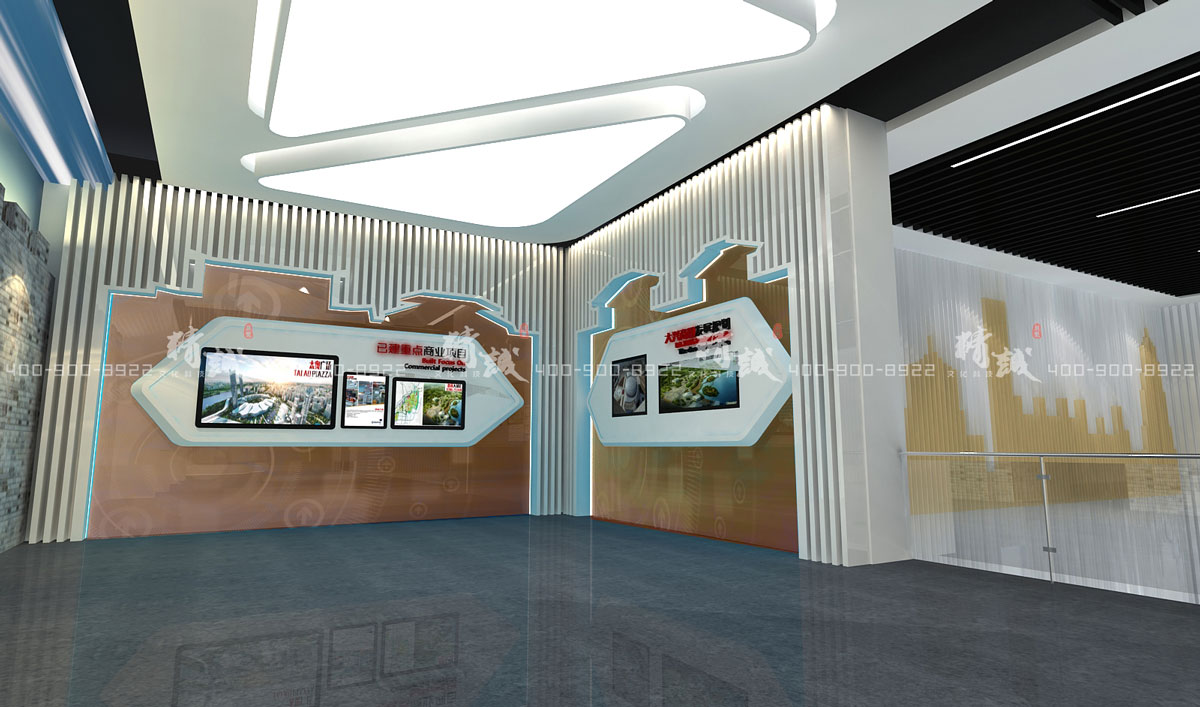用建筑上常用的“工字鋼”造型來展示發(fā)展歷程和領(lǐng)導(dǎo)關(guān)懷板塊,在現(xiàn)代化的展陳設(shè)計(jì)中融入建設(shè)的概念,形成不斷發(fā)展的內(nèi)涵,.后,通過視頻專題作為展廳結(jié)尾,描繪未來蓮湖發(fā)展藍(lán)圖。