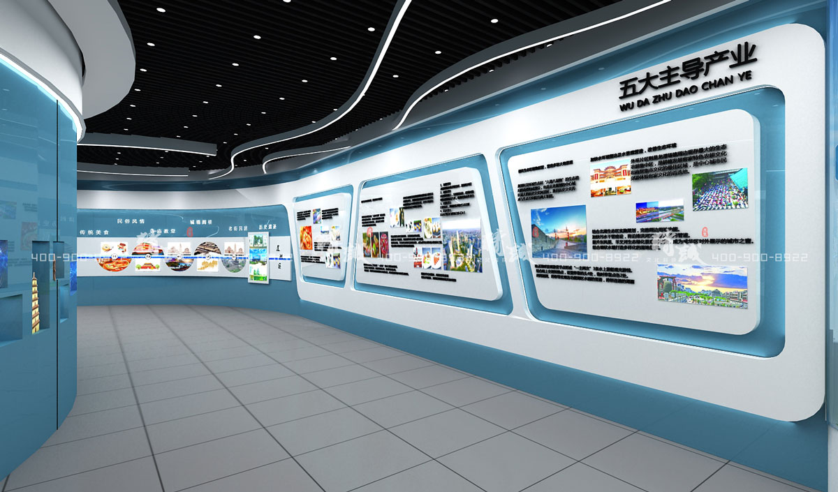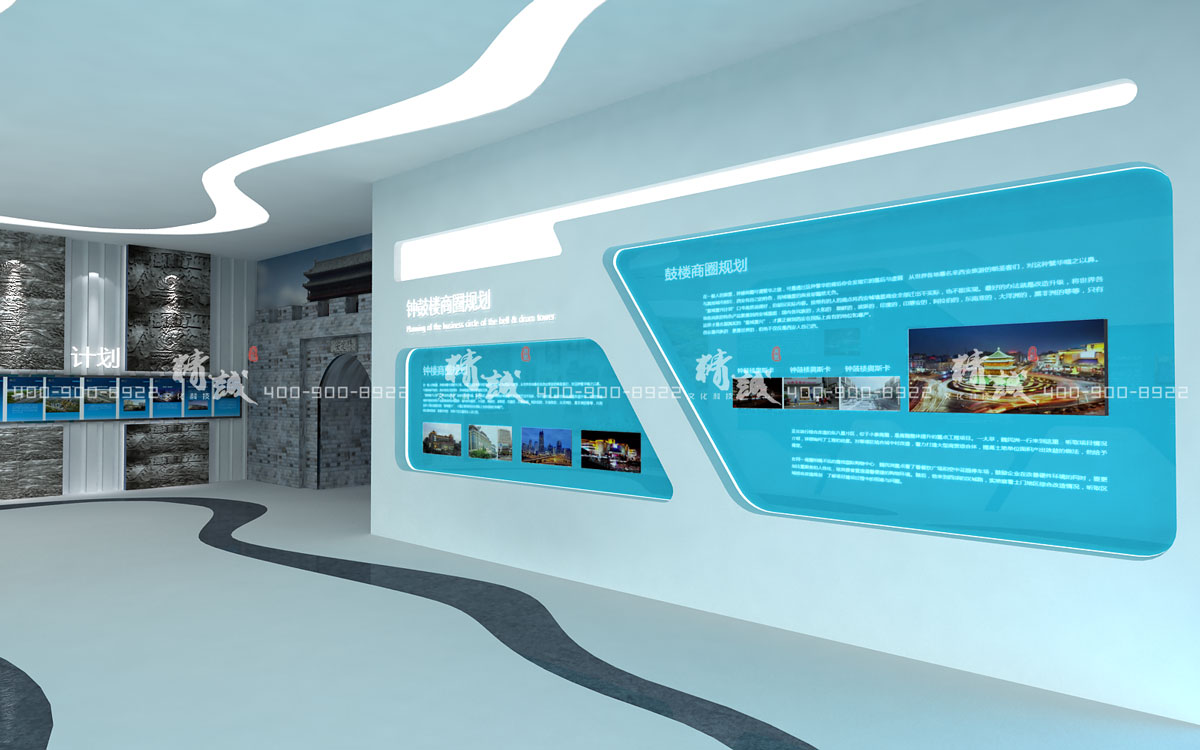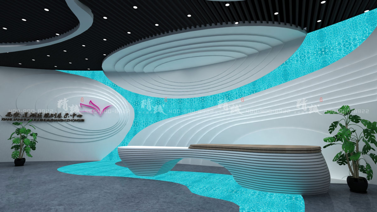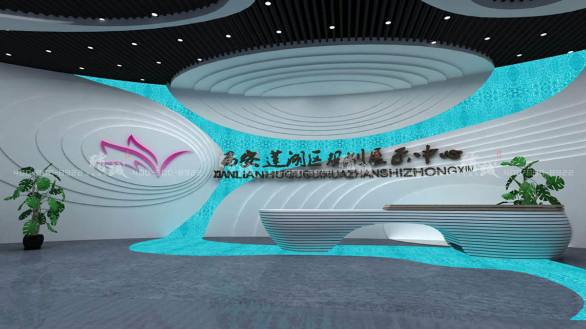 蓮湖,蓮花、湖水,我們通過蓮湖區(qū)字面含義提取出水滴漣漪的概念來設(shè)計(jì)形象墻,墻面的漣漪延伸入頂部,藍(lán)色的動態(tài)“湖水”從墻面蜿蜒流出到地面,形成墻、頂、地渾然一體的設(shè)計(jì)風(fēng)格,視覺素雅、動感,符合展覽館主題。