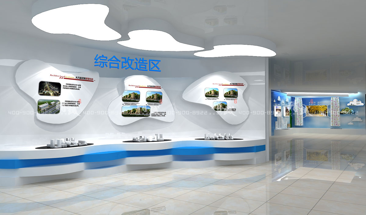 展覽館設(shè)計(jì)采用現(xiàn)代時(shí)尚的元素來設(shè)計(jì),運(yùn)用白、藍(lán)、灰三色妝點(diǎn)形成空間氛圍,通過色調(diào)和墻面及立體空間設(shè)計(jì)的合理搭配,展示蓮湖形象形象、雄厚實(shí)力、創(chuàng)新科技、生態(tài)環(huán)保的美好發(fā)展前景。