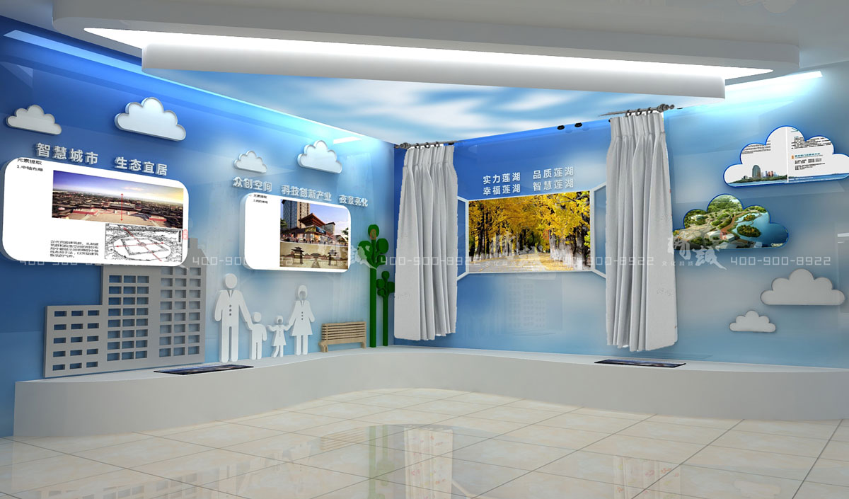用云朵的墻面造型展示云端智能、智慧城市概念,通過自動窗簾和顯示屏展示“窗外”春夏秋冬優(yōu)美環(huán)境,利用觸摸屏和落地查詢機(jī)展示眾創(chuàng)空間、科技創(chuàng)新產(chǎn)業(yè)和夜景亮化工程。