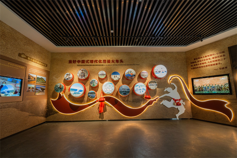 展示標(biāo)題上,采用當(dāng)?shù)亓鱾鞯蔫F路民謠進(jìn)行編織,將其劃分成“筑路?中央和咱心連心”“圓夢(mèng)?火車開到寶塔山”“發(fā)展?坐上火車逛北京”“騰飛?巨龍馳騁譜新篇”四大版塊,以全方位展現(xiàn)陜北鐵路從規(guī)劃、建設(shè)到發(fā)展壯大的歷史進(jìn)程,進(jìn)而生動(dòng)反映陜北鐵路取得的突出成就及對(duì)陜北革命老區(qū)經(jīng)濟(jì)社會(huì)發(fā)展的推動(dòng)作用。