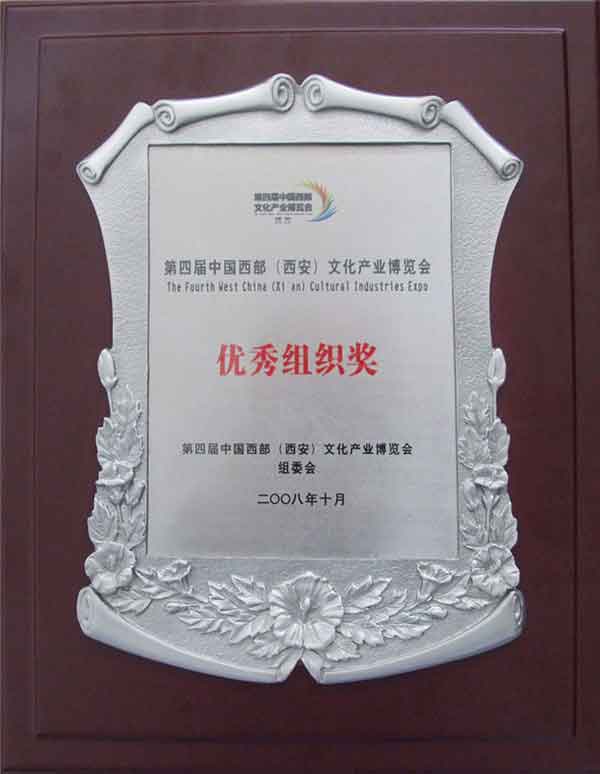 上圖是我們的第四屆中國西部(西安)文化產業(yè)博覽會組委會2008年十月頒發(fā)的第四屆中國西部(西安)文化產業(yè)博覽會優(yōu)秀組織獎,證書,以資鼓勵!