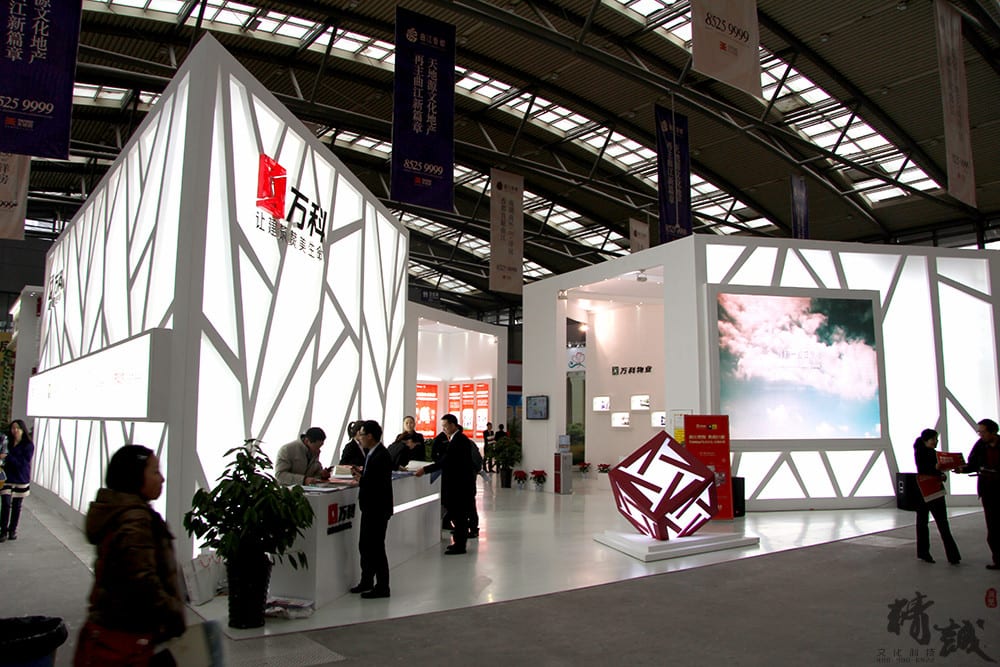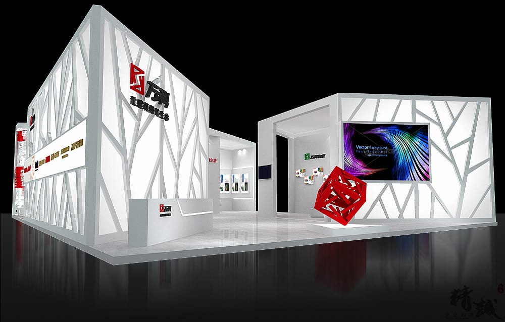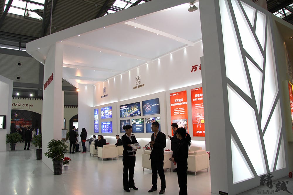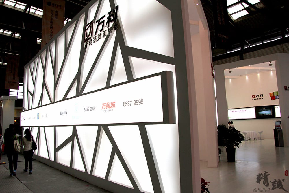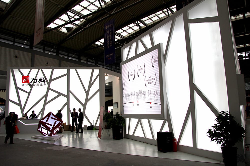 西安展覽公司對(duì)于萬科集團(tuán)的展覽設(shè)計(jì)整個(gè)墻面造型以分支狀造型裝飾,配以白色背光,讓墻面發(fā)散出很強(qiáng)的時(shí)尚氣息;而設(shè)計(jì)的亮點(diǎn)在于入口處實(shí)體化的logo立方體,六面統(tǒng)一設(shè)計(jì),進(jìn)而鏤空,將logo塑造的非常立體而吸引別致,引人注目。