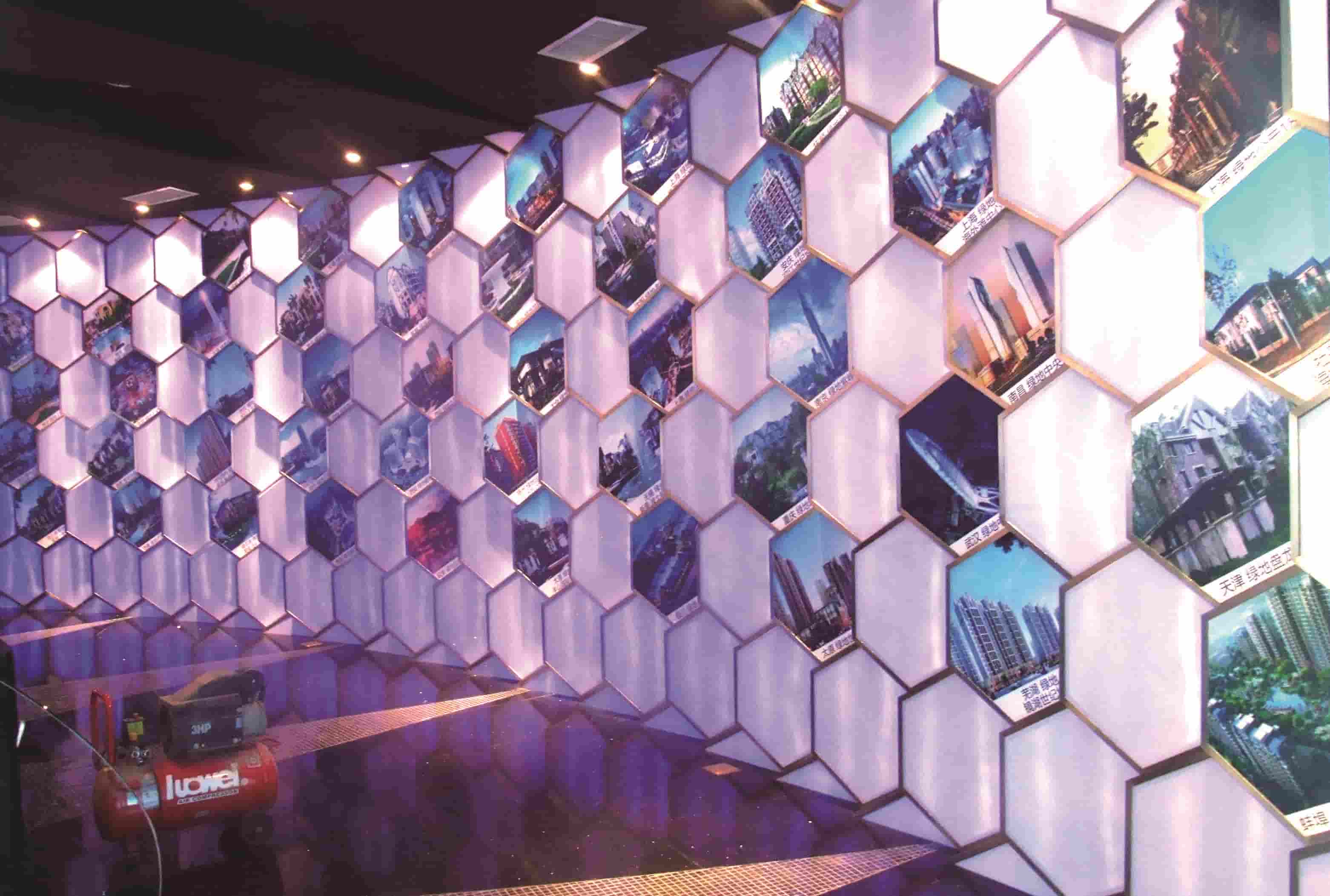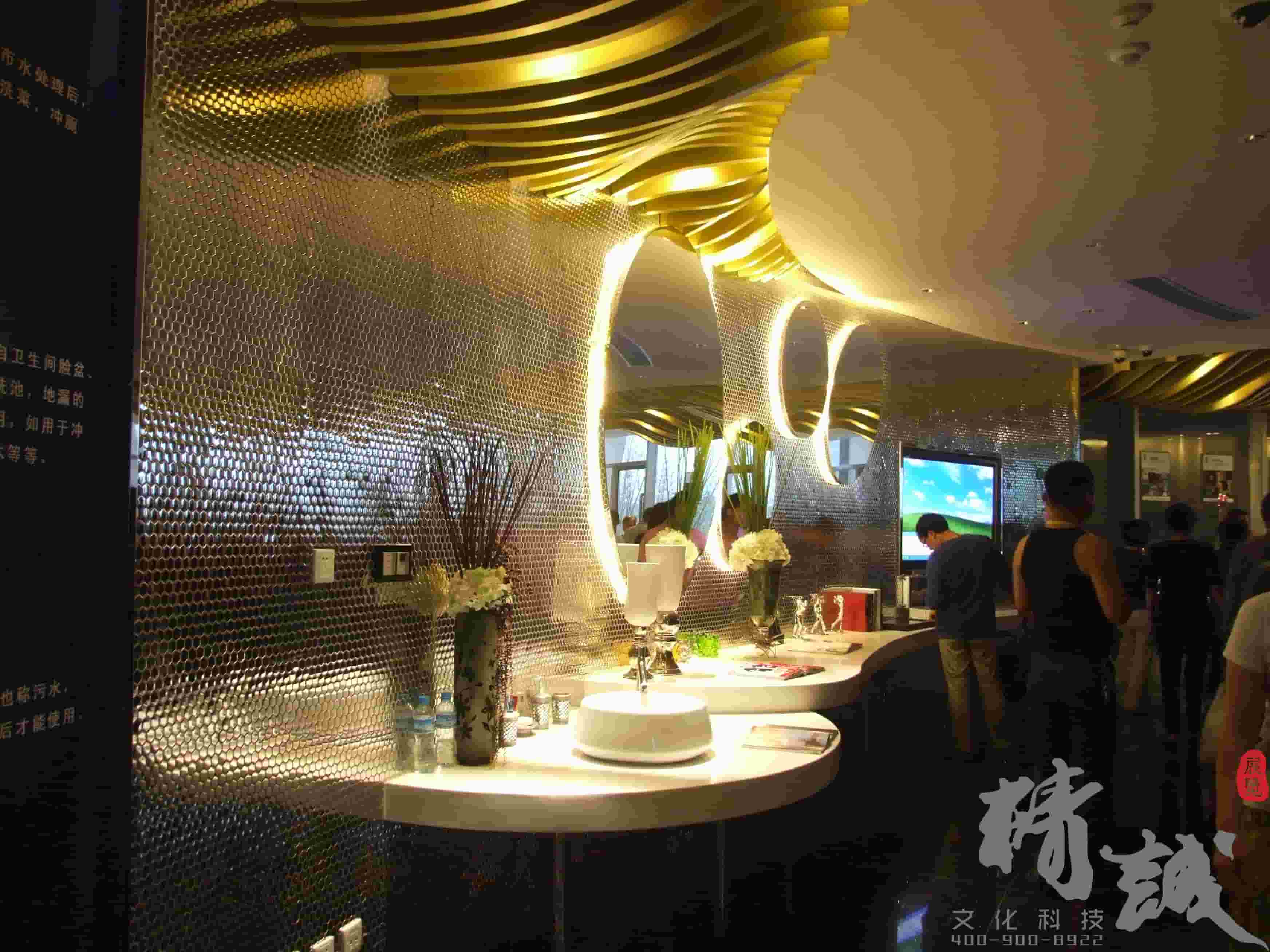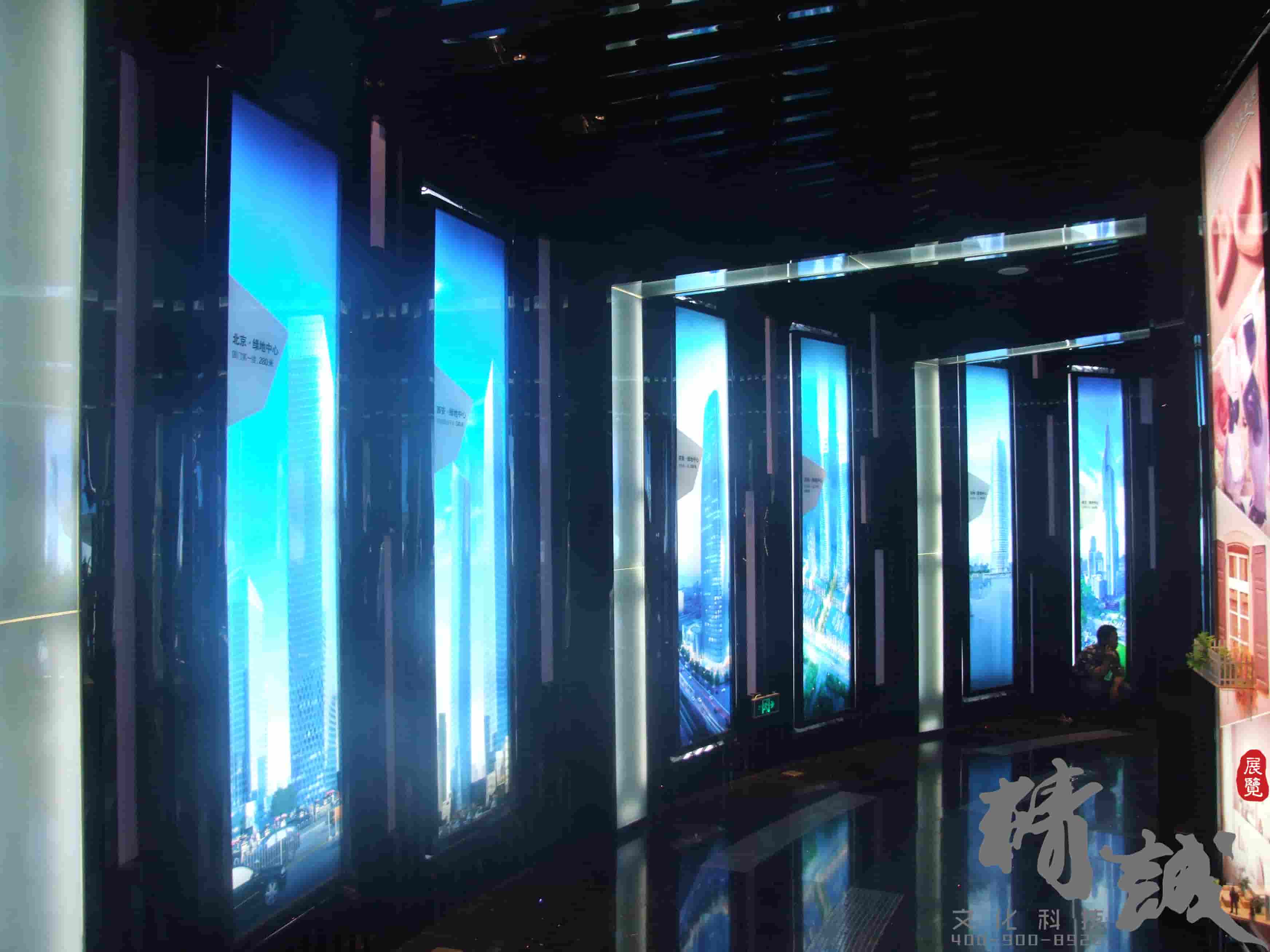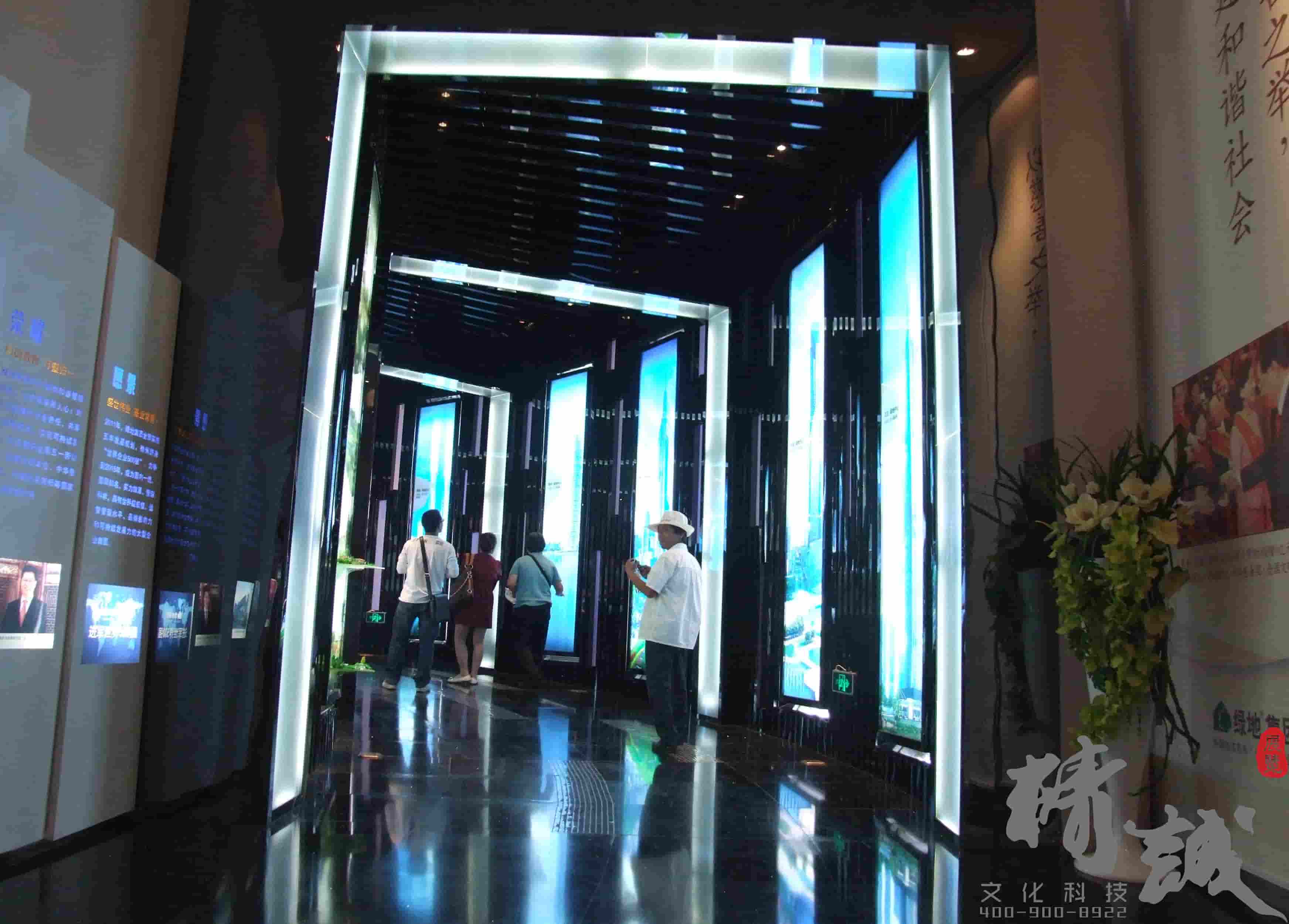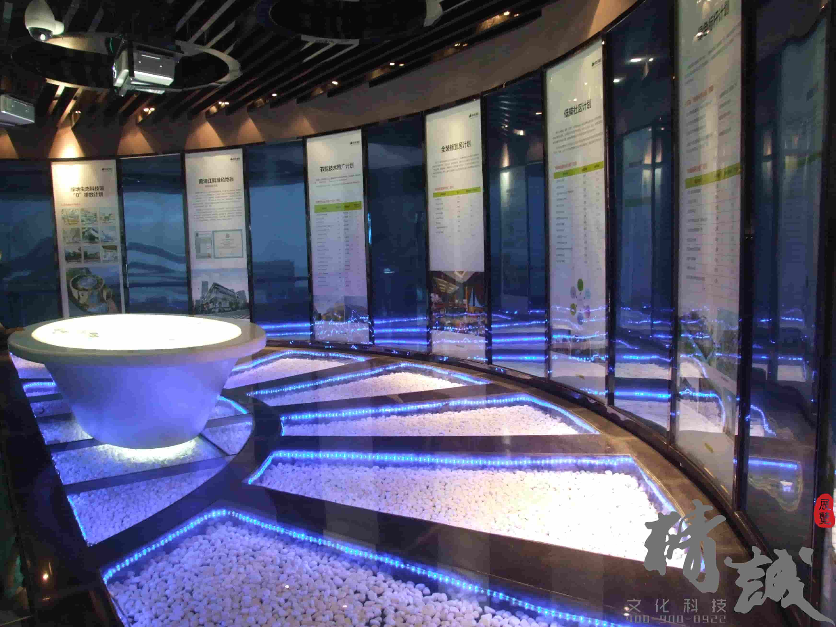 并且這個(gè)主要利用在現(xiàn)代裝飾風(fēng)格中融入生態(tài)元素,突顯生態(tài)館理念。區(qū)別于常規(guī)整體墻面造型,利用高低錯(cuò)落有序的獨(dú)立墻體設(shè)計(jì),使整個(gè)弧形墻面更加富有層次感;利用蜂巢狀的陣列造型,讓墻面顯得更加自然、生動(dòng)。而藍(lán)色燈光的合理運(yùn)用,讓展廳在視覺效果上更加富有科技感。